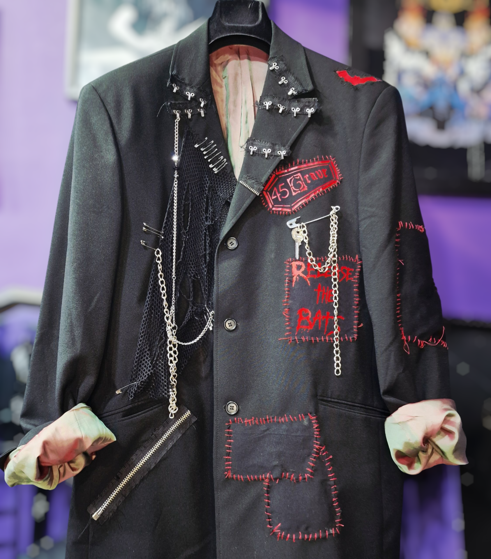 Ritorna al negozioBlazer grigio nero con cuciture rosse e patch Release The Bats e 45 Grave.
