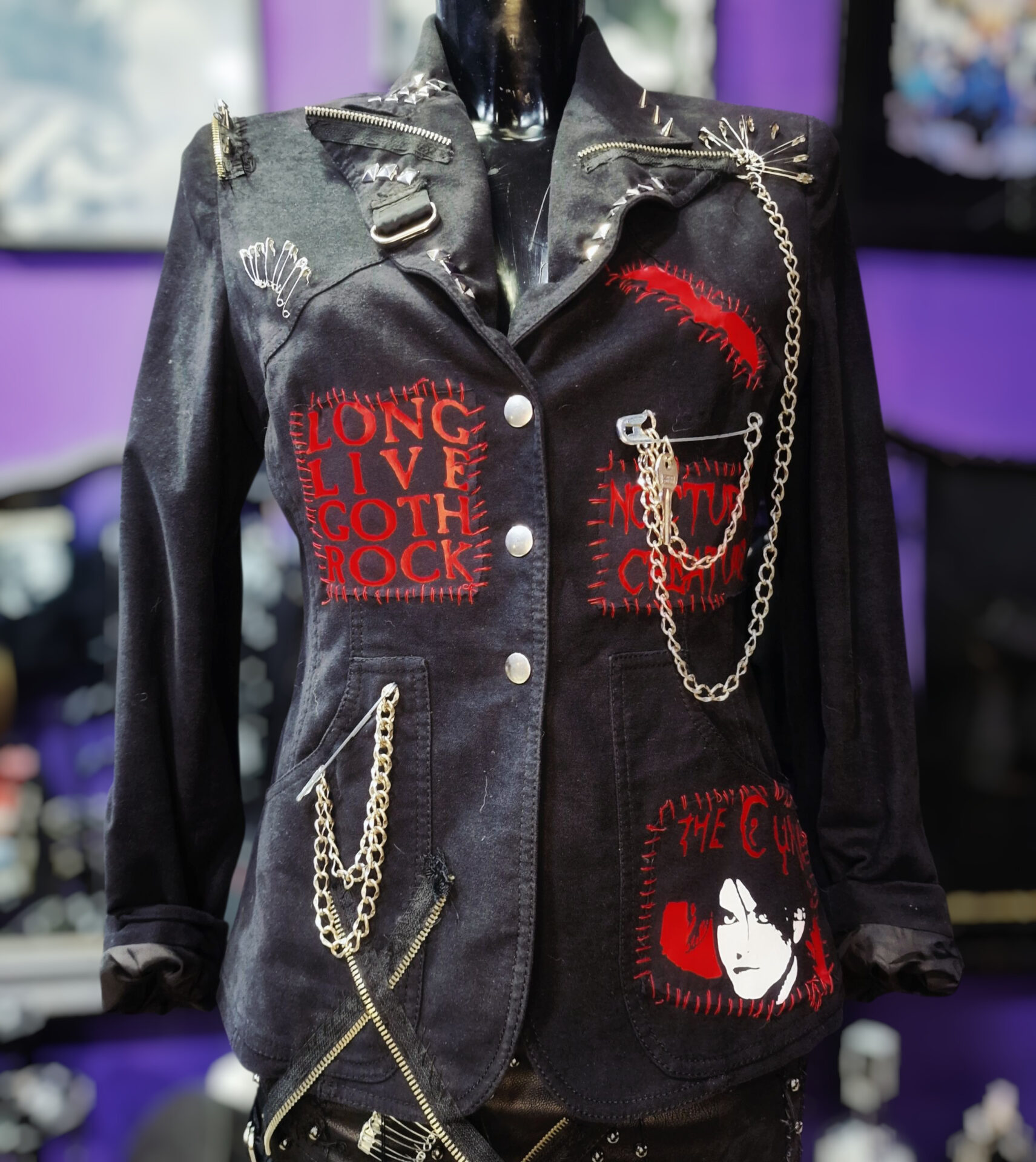Ritorna al negozioBlazer nero donna monopetto con patch goth e The Cure, spille da balia, borchie. catene e riferimenti metallici.