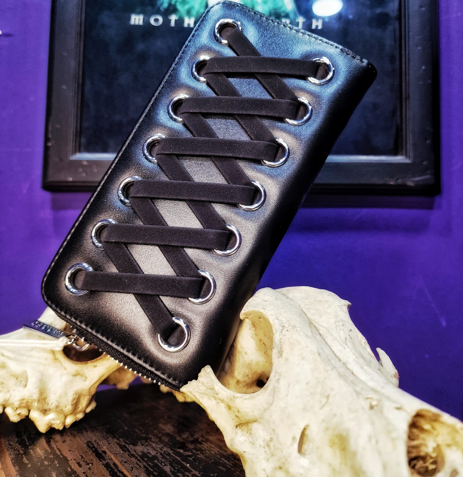 Ritorna al negozioPortafoglio nero Banned Alternative con stringhe e rivetti stile corsetto frontale.