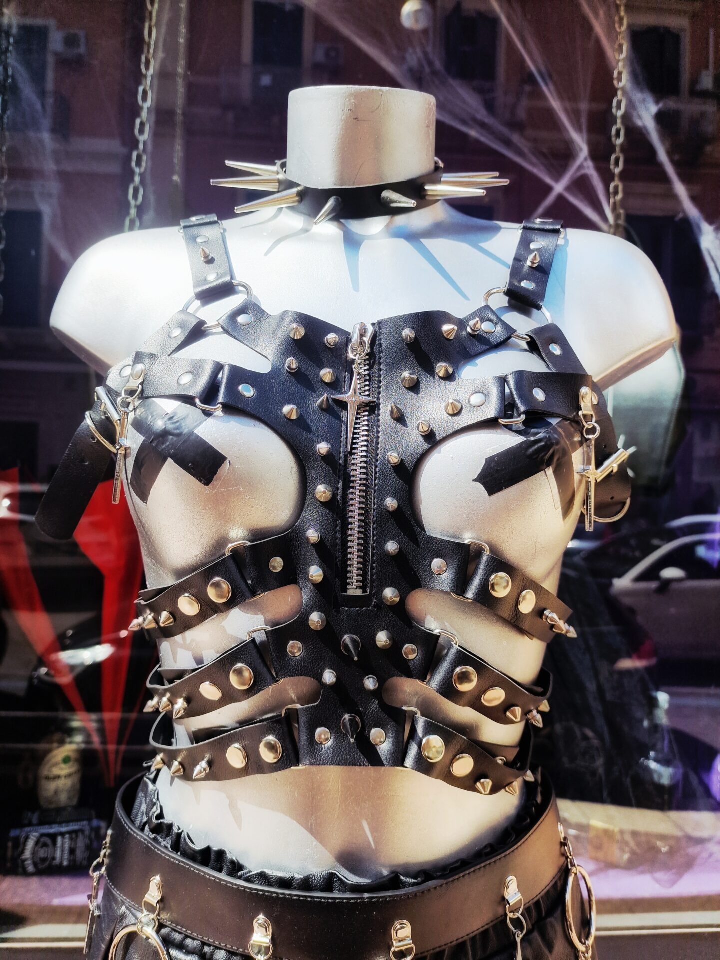 Ritorna al negozioHarness Goth/Punk a gabbia di ecopelle nera con borchie metalliche, anelli e zip frontale.