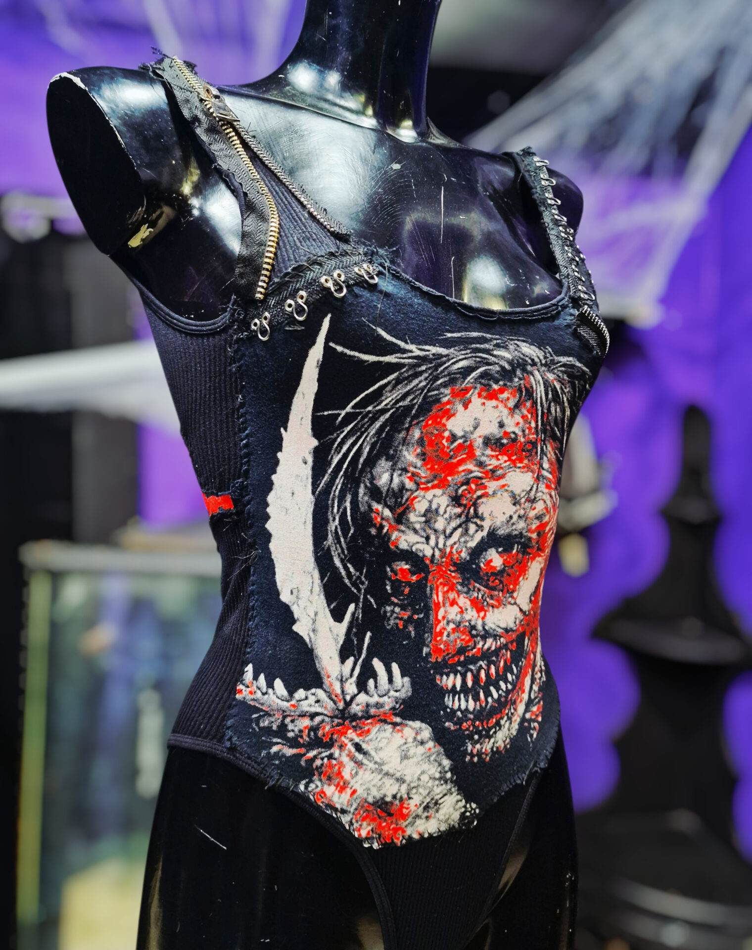 Ritorna al negozioBody nero custom Cannibal Corpse con grafica cucita mano fronte/retro e riferimenti metallici montati.
