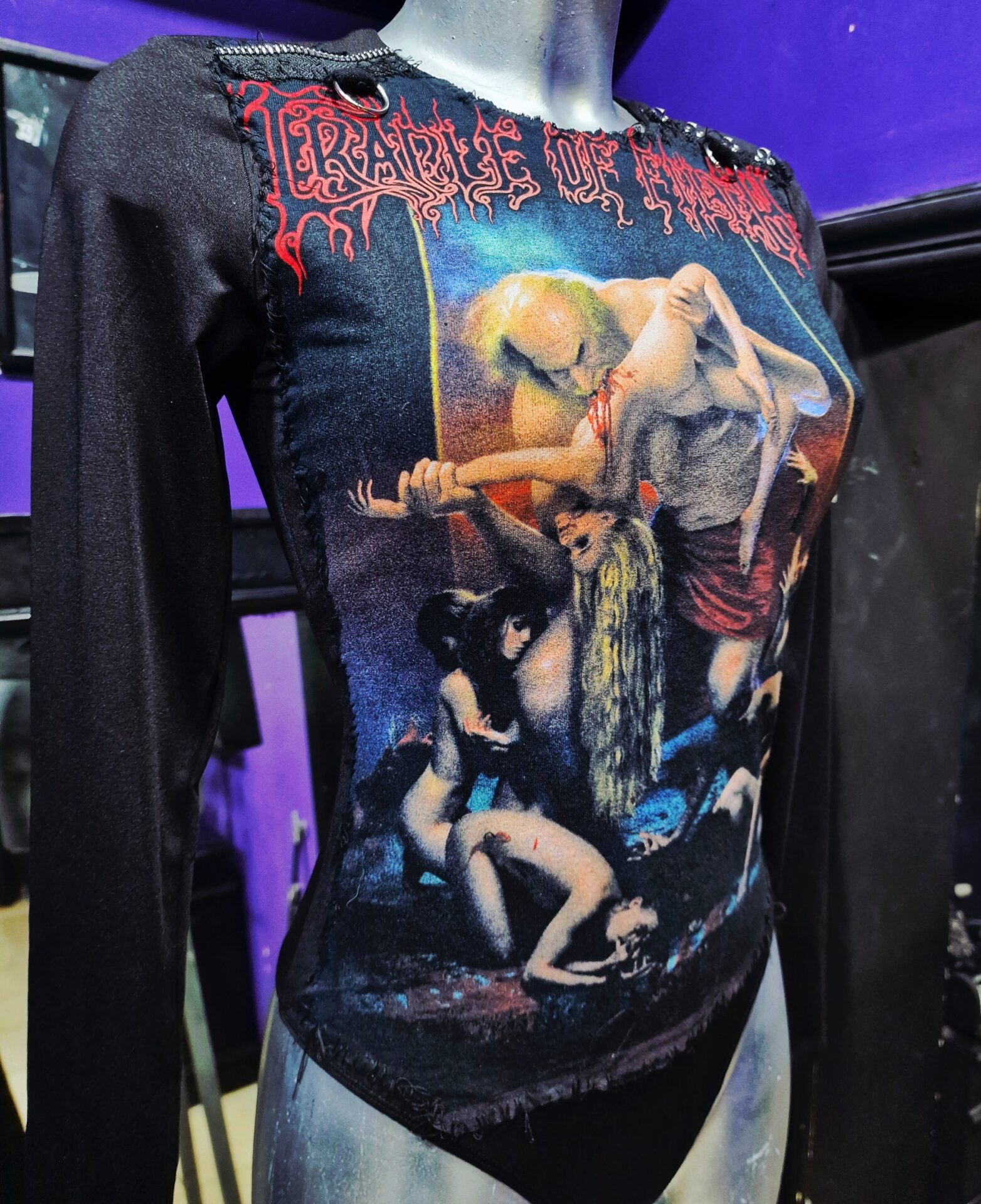Ritorna al negozioBody nero a manica lunga custom con grafica Cradle Of Filth cucita mano frontale e cinghie con O-Ring montate.