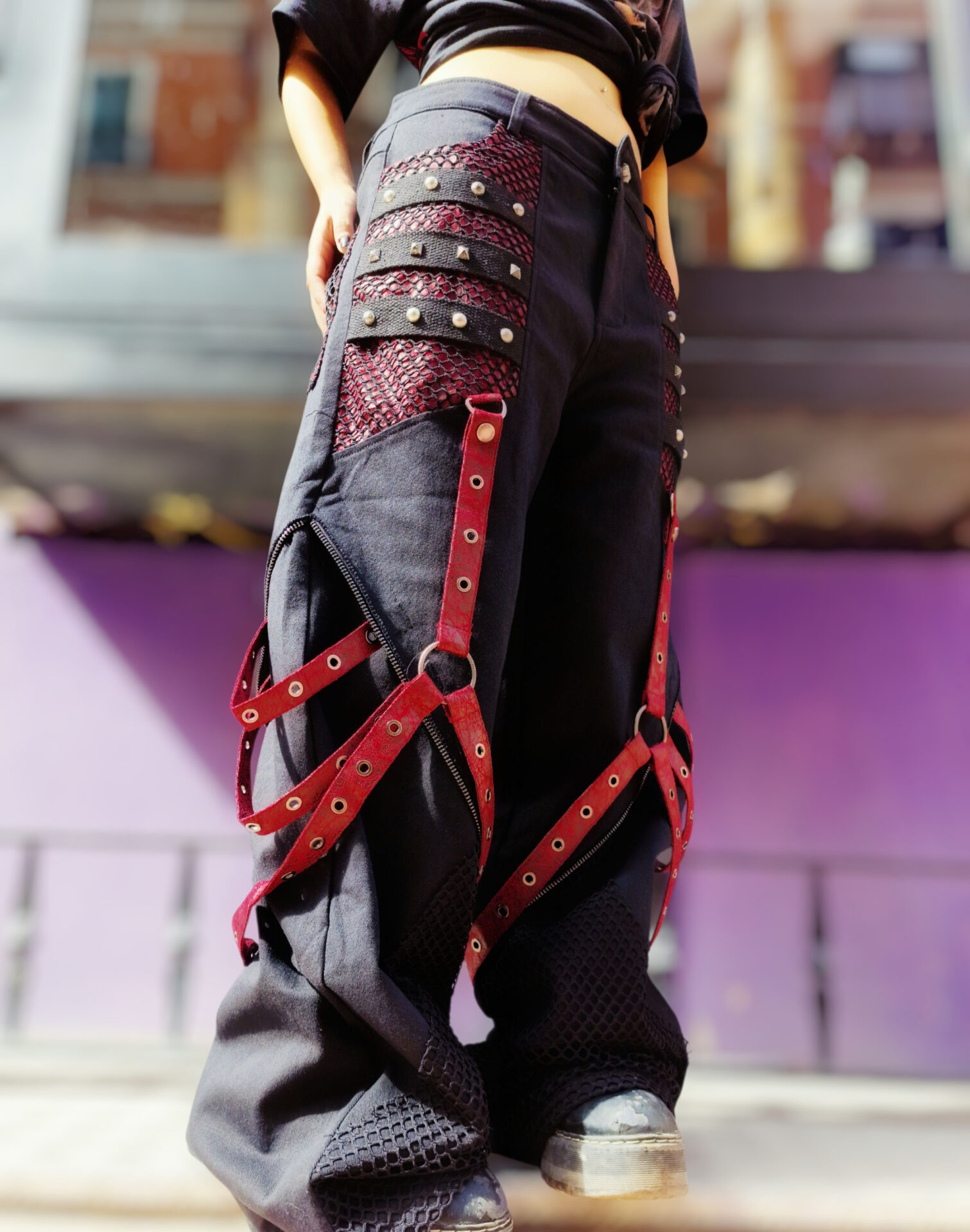 Il pantalone è caratterizzato da un imbracatura in finta pelle rossa staccabile.