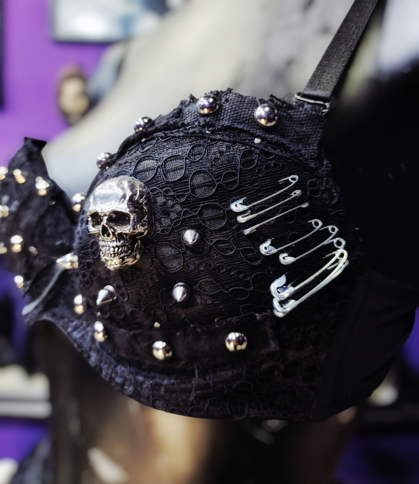 Reggiseno nero custom con borchie, spille da balia e teschio metallico.