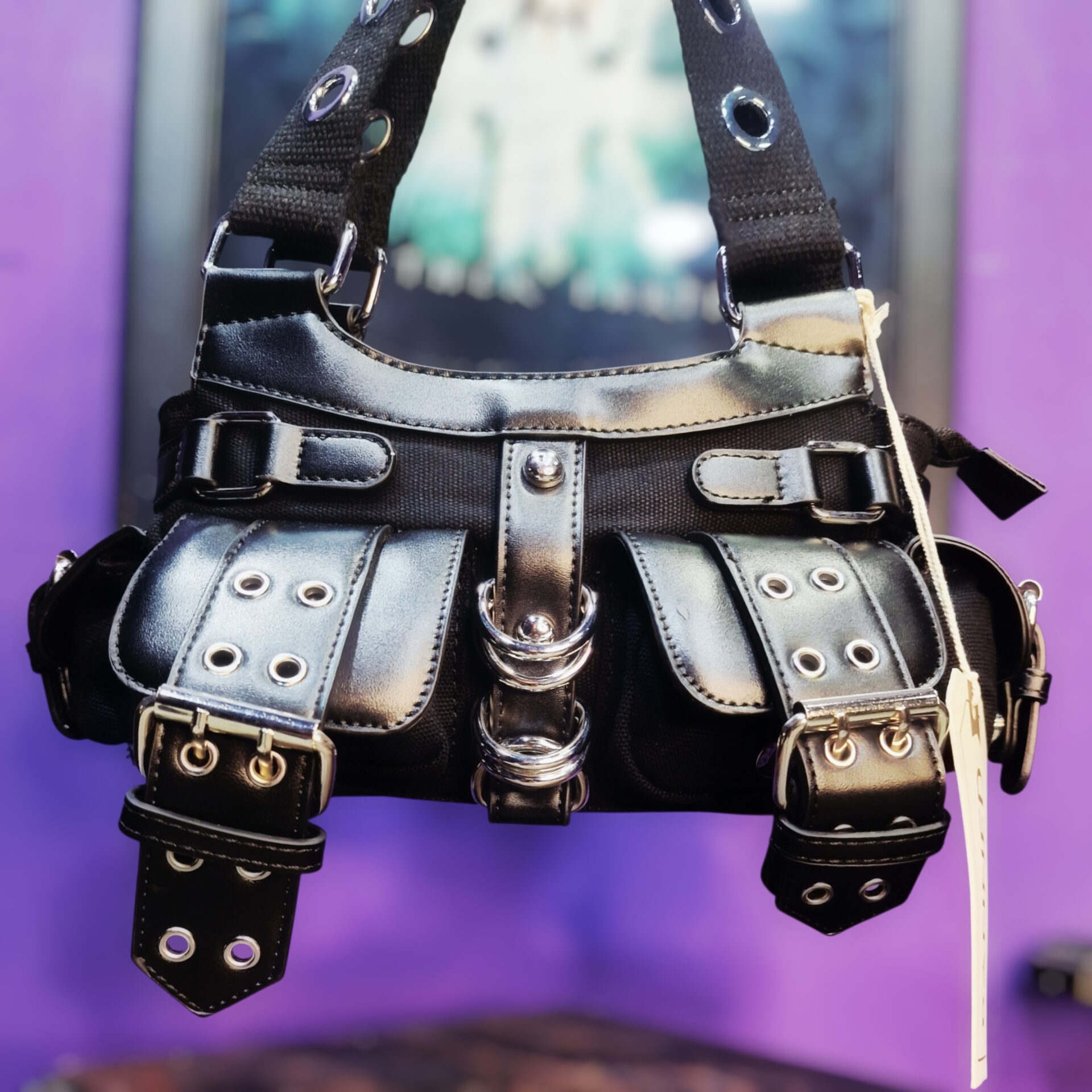 Ritorna al negozioBorsa nera Banned dalla forte ispirazione goth e punk con numerose tasche e grosse fibbie argentate che le conferiscono un look distintivo e metallico.