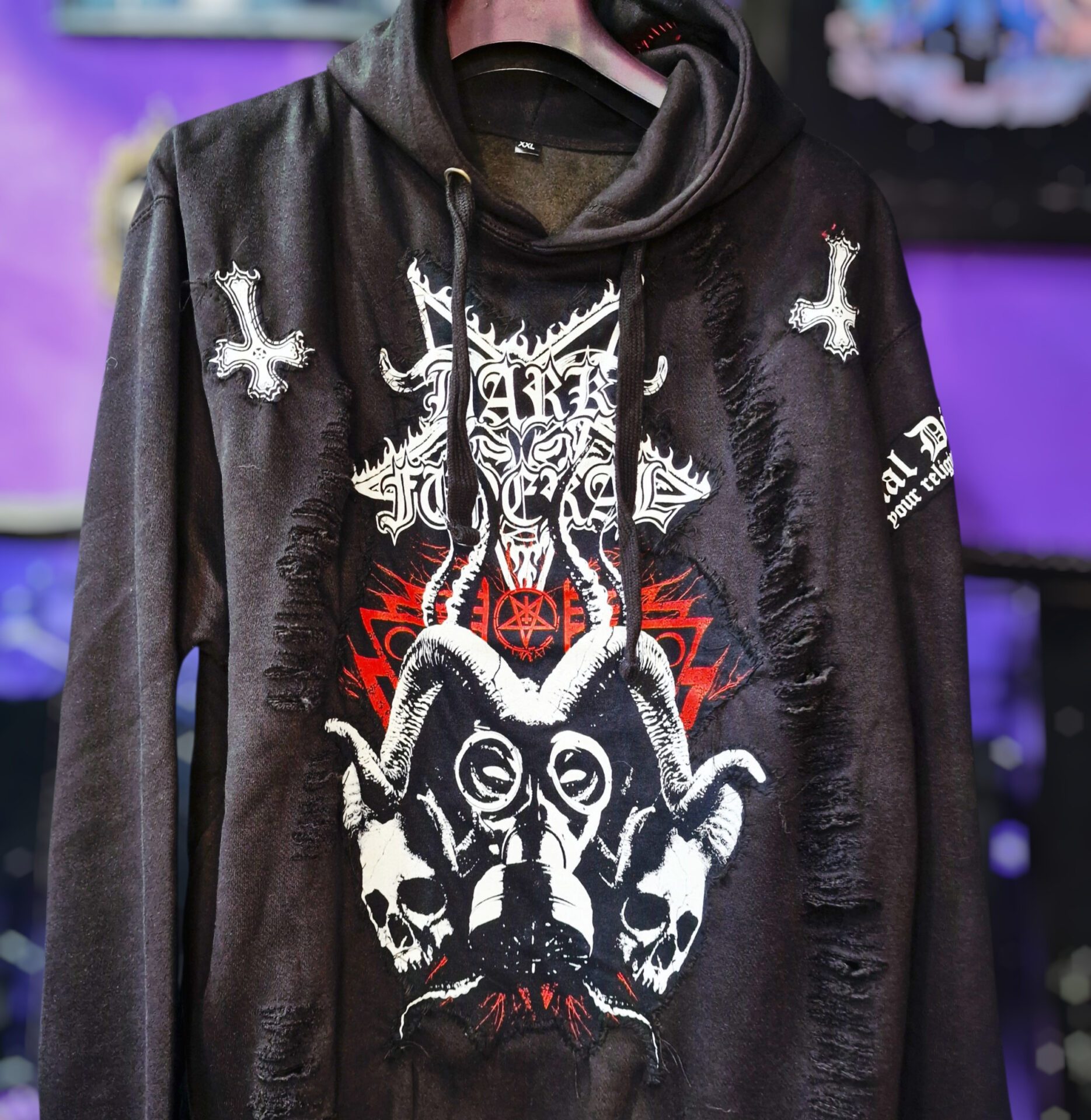 Ritorna al negozioFelpa nera custom Dark Funeral con grafica frontale e cappuccio.