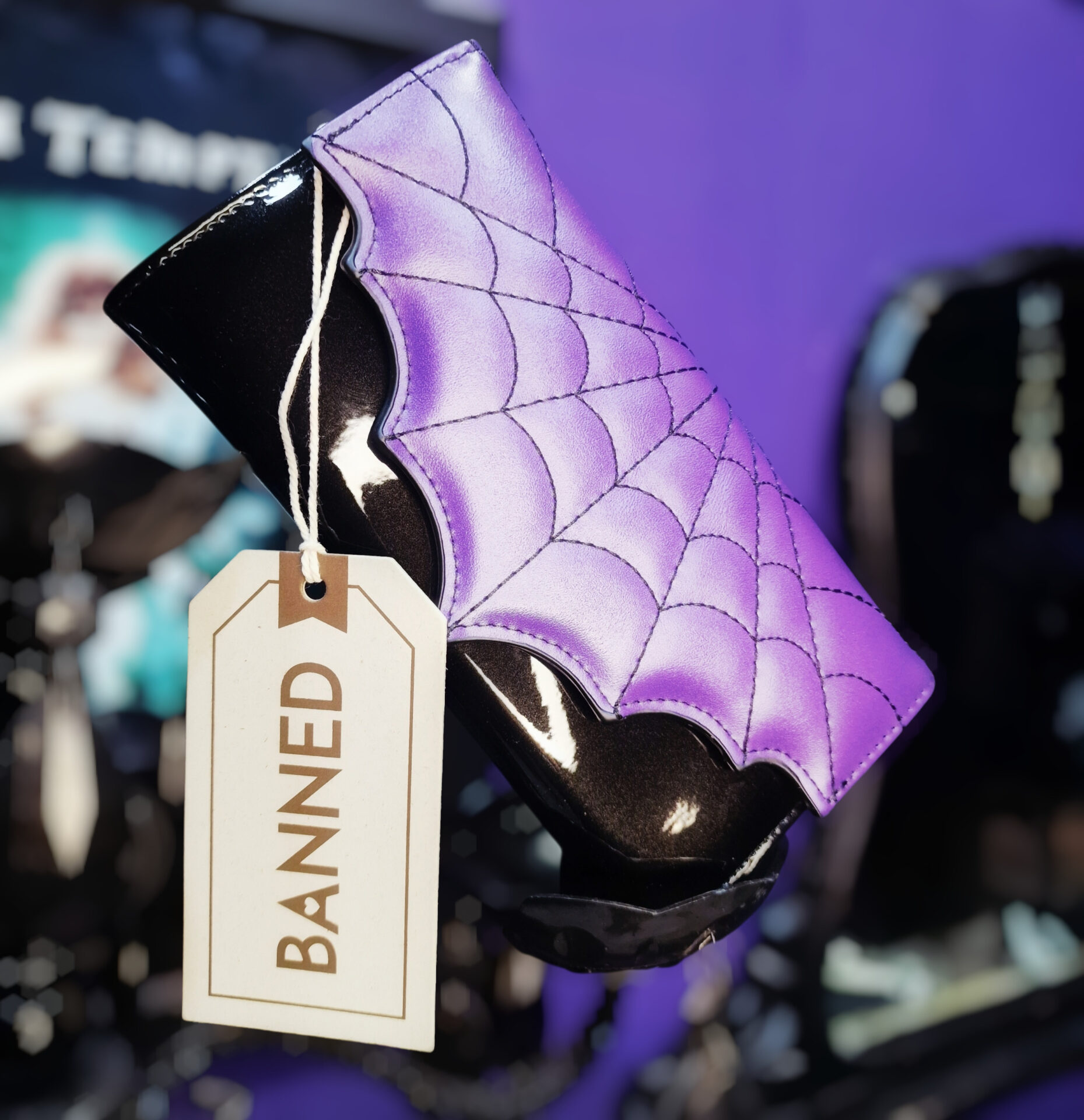 Ritorna al negozioPortafoglio Banned Alternative laccato nero e viola di ispirazione retrò.