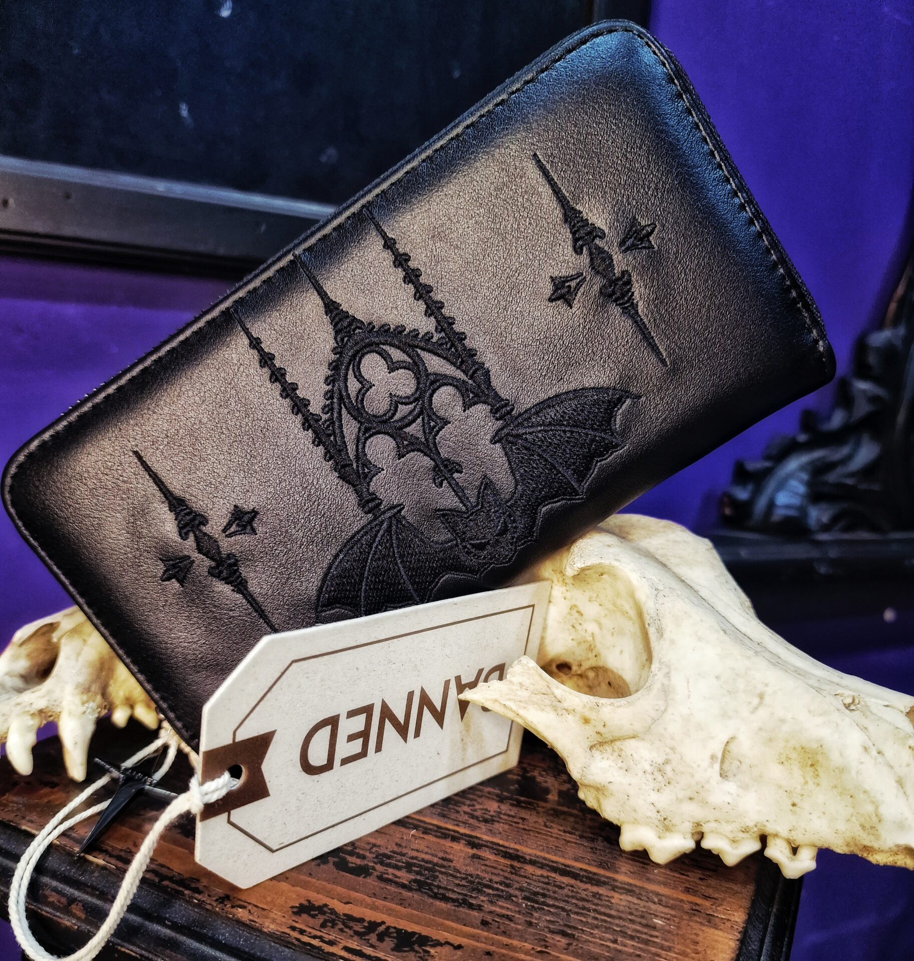 Ritorna al negozioPortafoglio Banned Alternative ecopelle nera dal design gotico con pipistrello e croci cuocite.