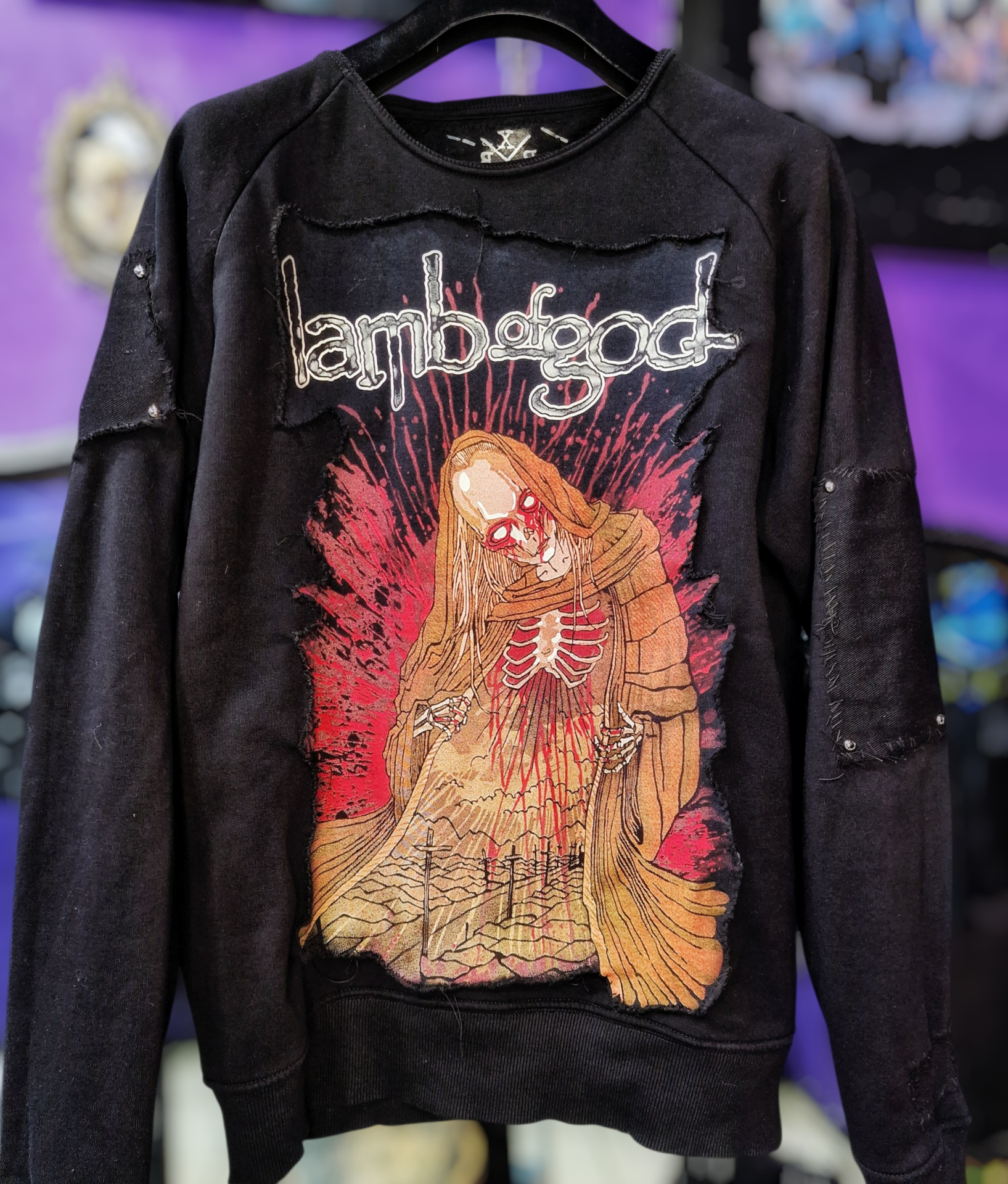 Ritorna al negozioFelpa nera custom Lamb Of God con grafica frontale e toppe con rivetti cromati.