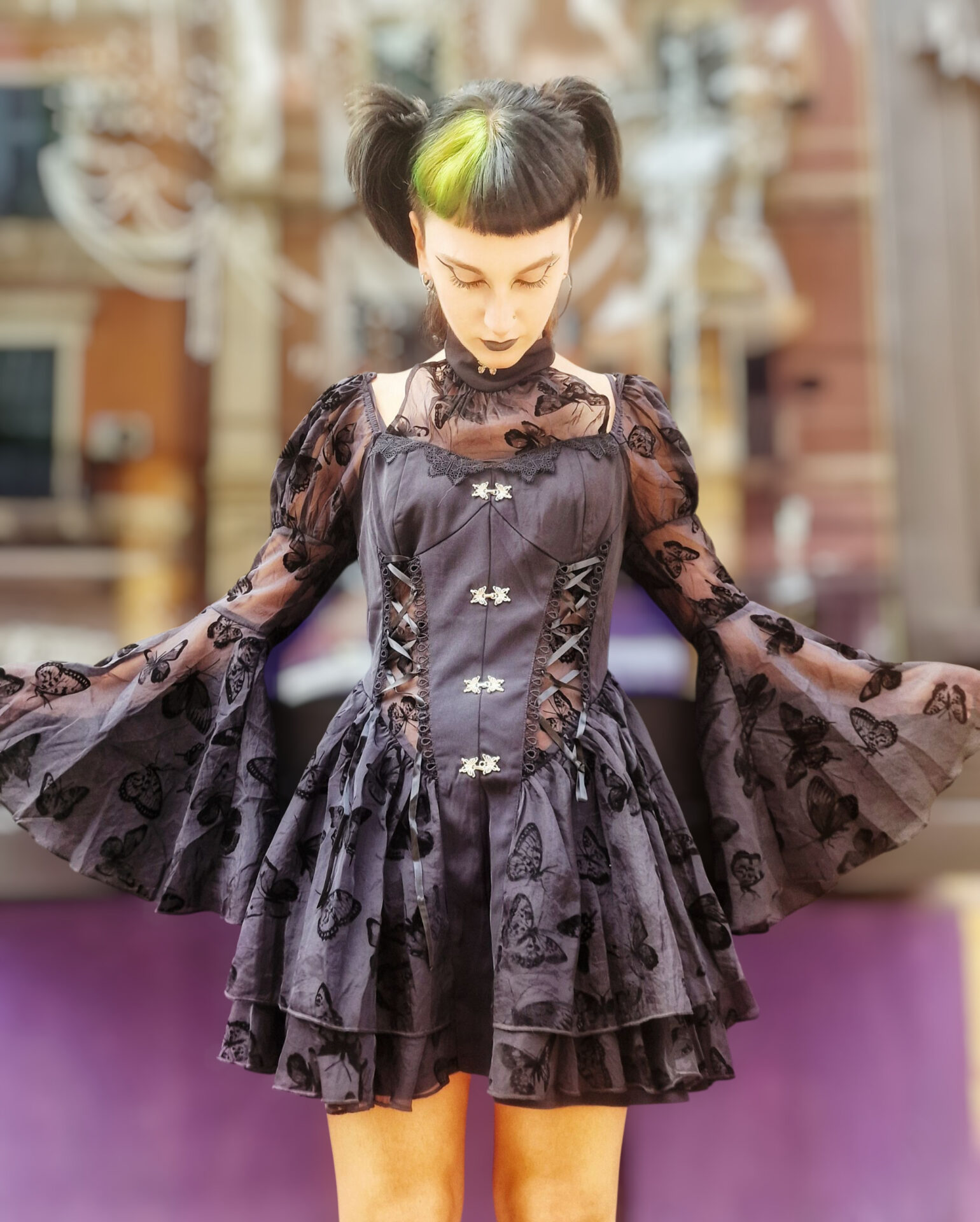 Abito gotico/romantico in chiffon nero con maniche lunghe svasate stile Giulietta.