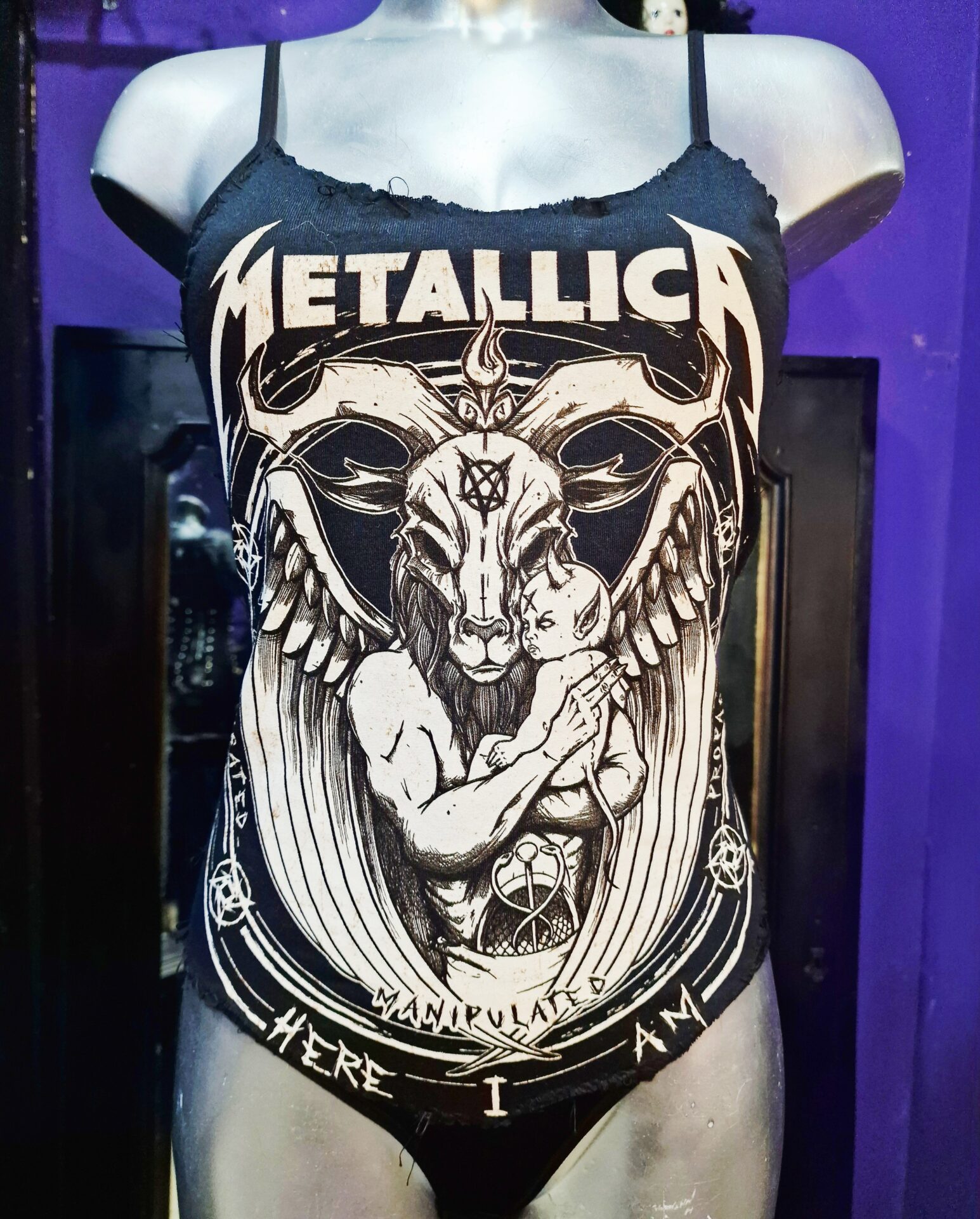 Ritorna al negozioBody nero custom Metallica con grafica cucita mano frontale e riferimenti metallici montati.
