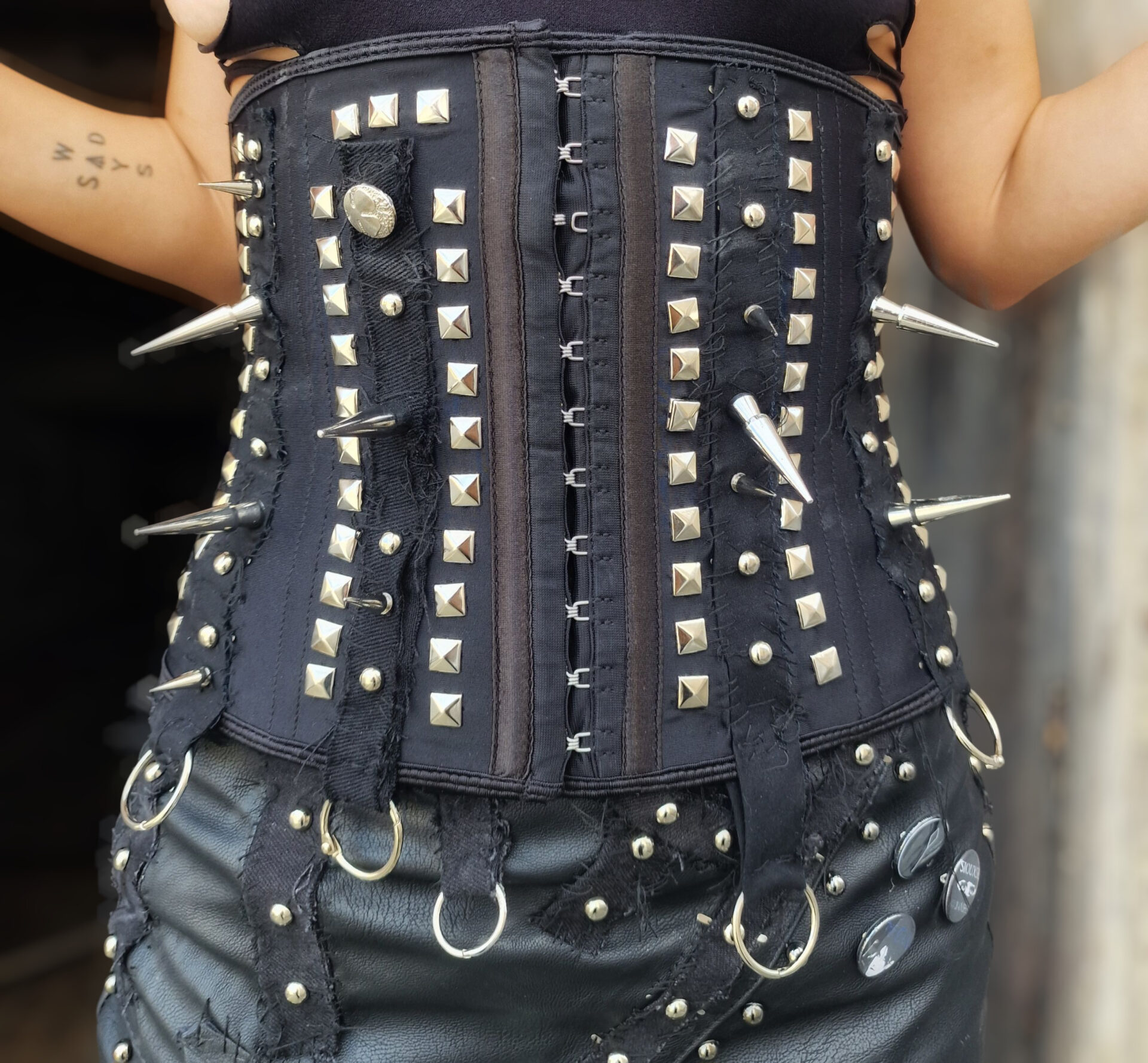Ritorna al negozioCorsetto nero sottoseno custom rivisitato con parti di tessuto riciclate e borchie di vario tipo.