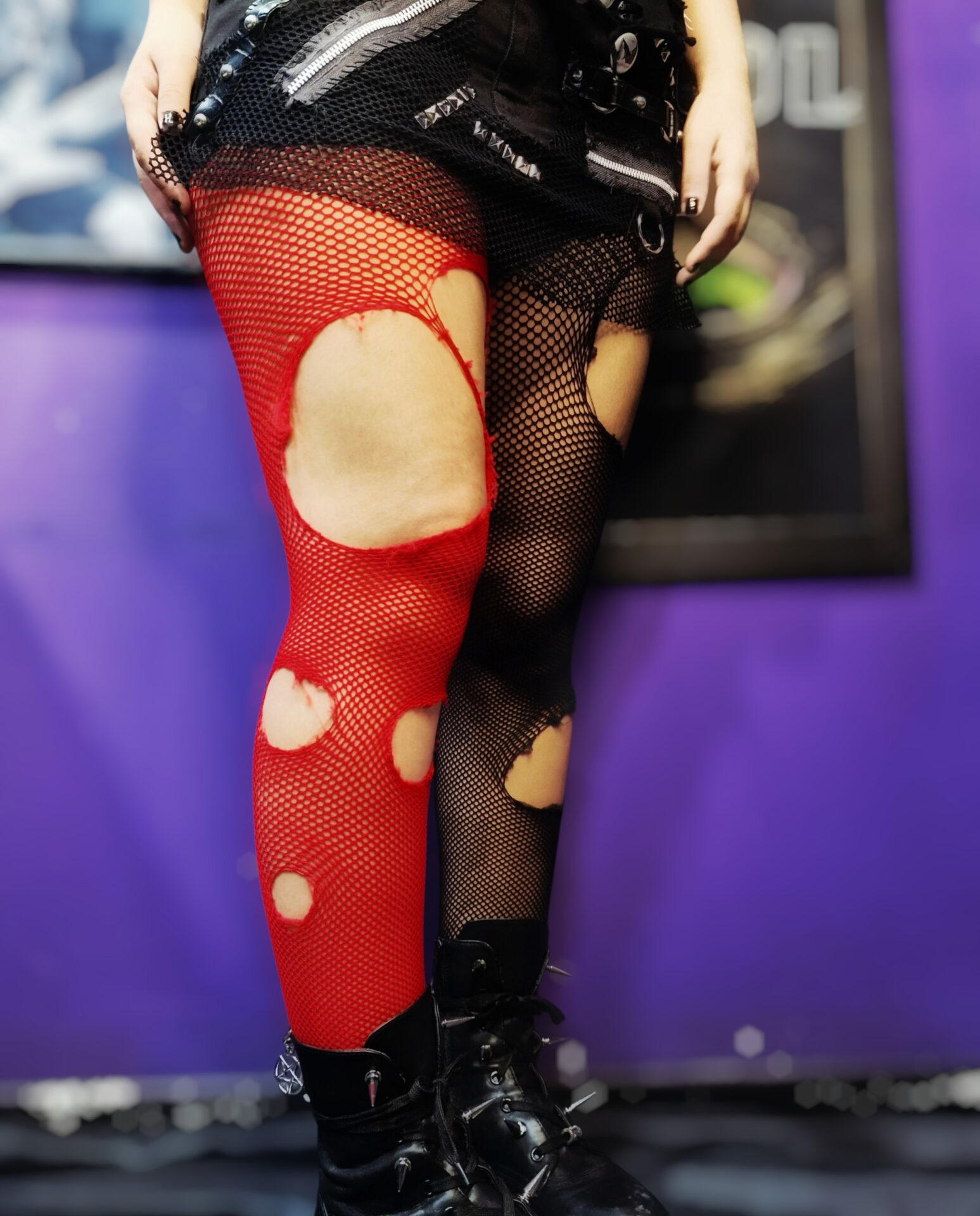 Ritorna al negozioCollant a rete stretta con rotture caratterizzato da gambe di due colori differenti una dall’altra.