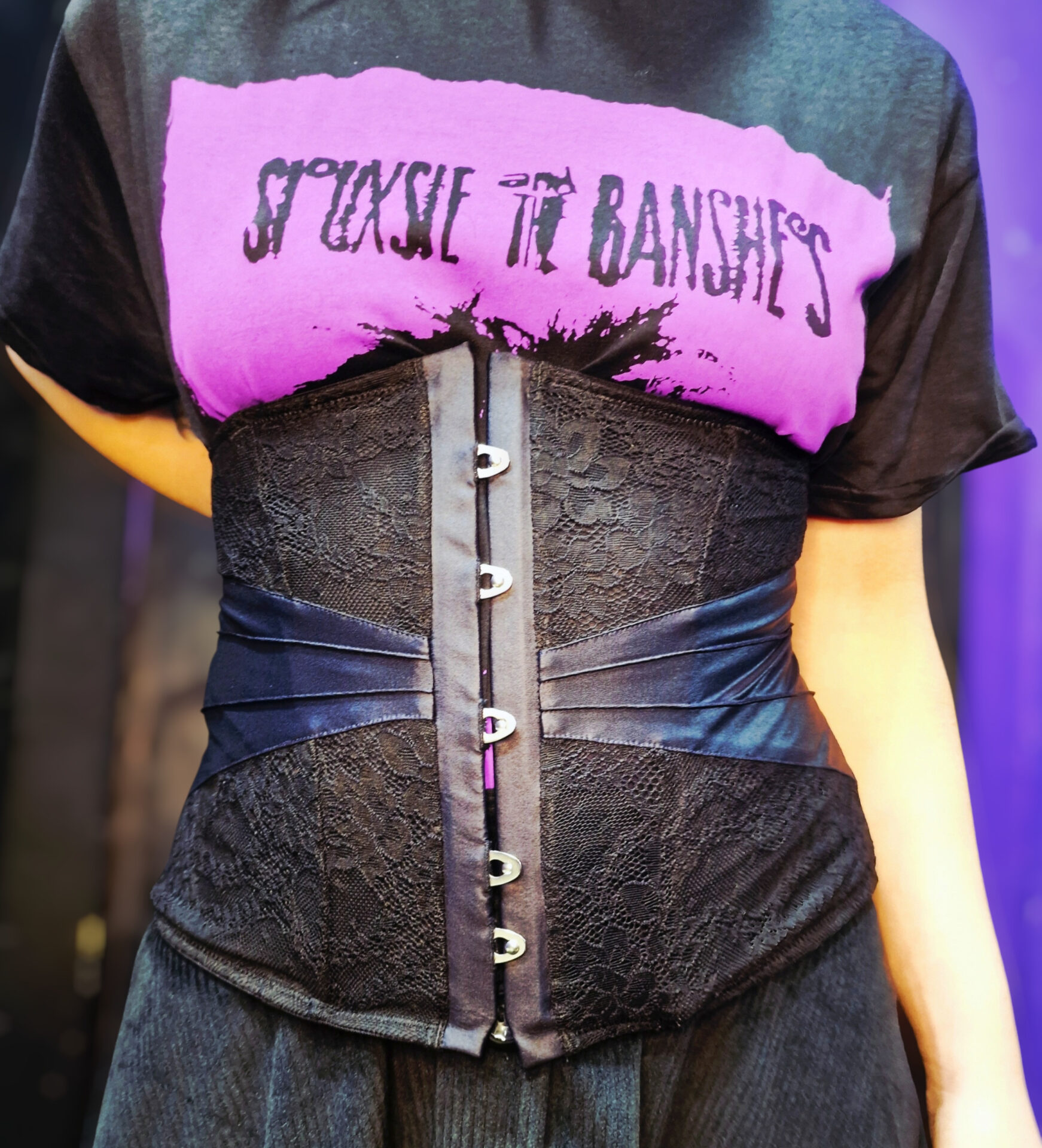 Ritorna al negozioCorsetto sottoseno di pizzo nero e riferimenti in ecopelle.