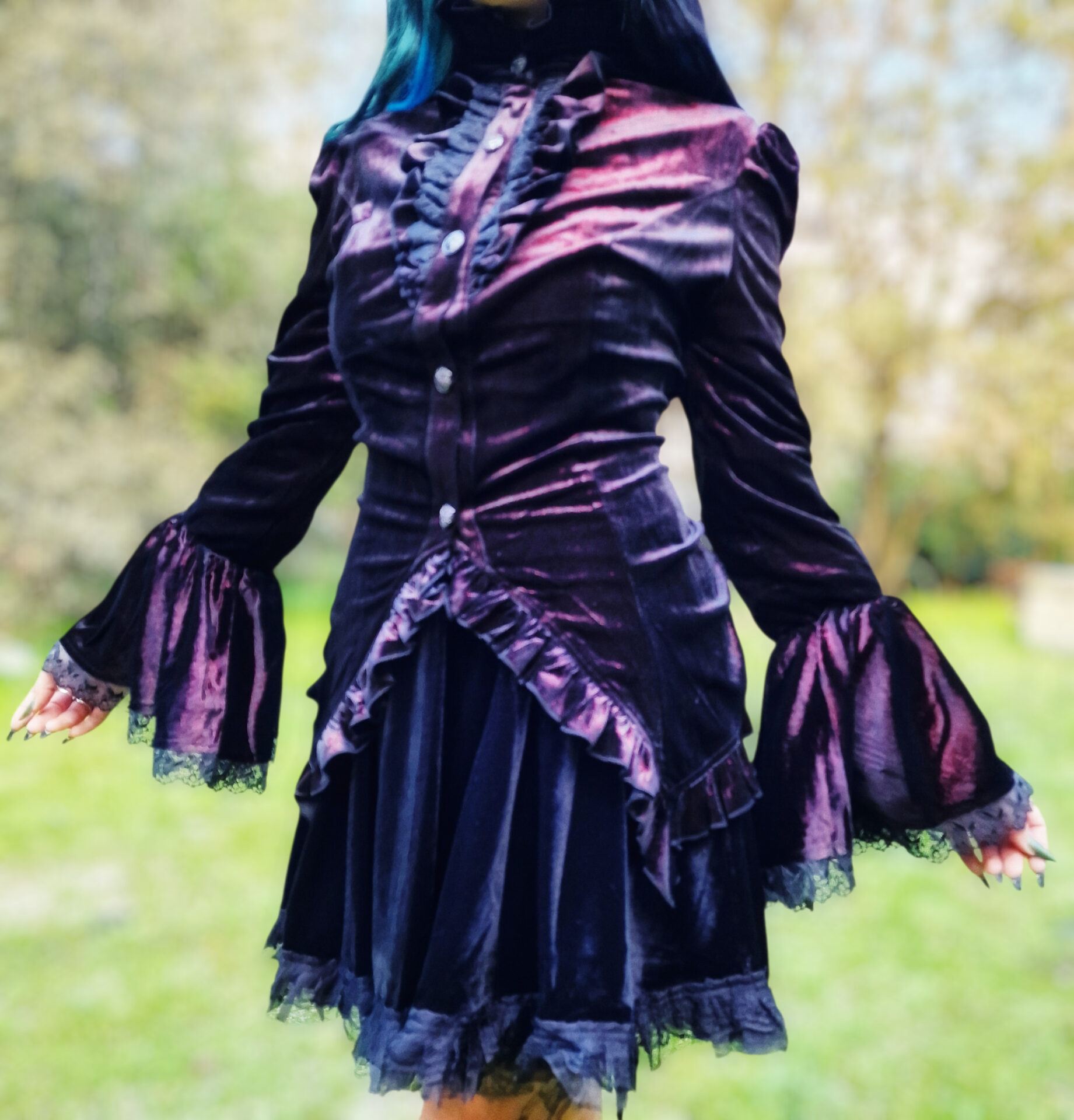Ritorna al negozioCamicia aderente gotica da donna in velluto rosso a maniche lunghe e spalline a sbuffo.